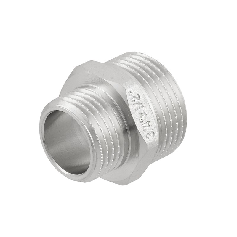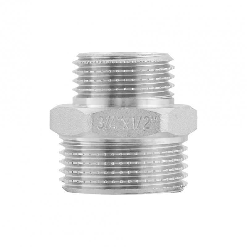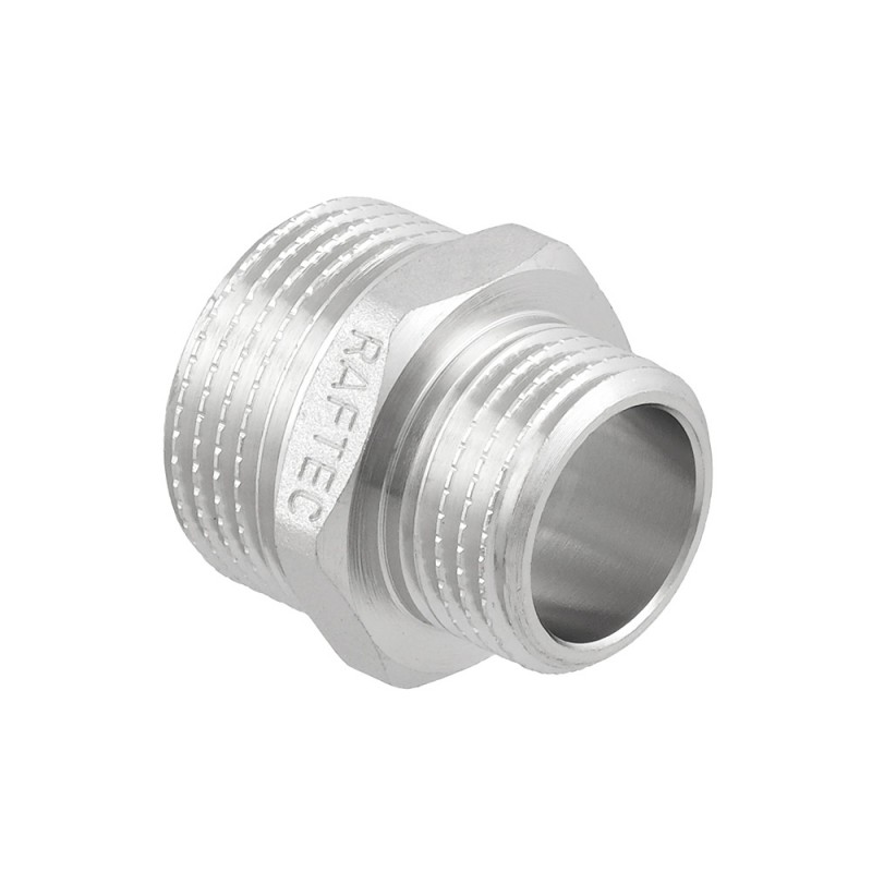 Raftec threaded fitting - nickel-plated brass adapter nipple for connecting pipeline elements of different diameter. External cylindrical pipe thread ISO 228, EN 10226. Hexagonal body for a wrench.