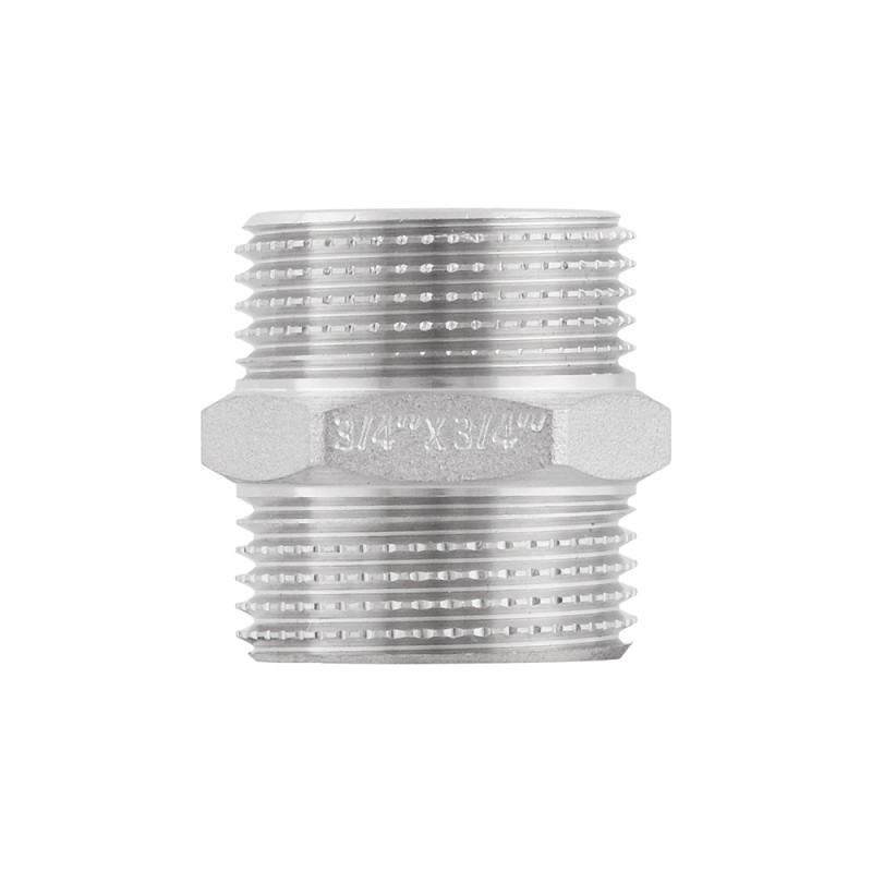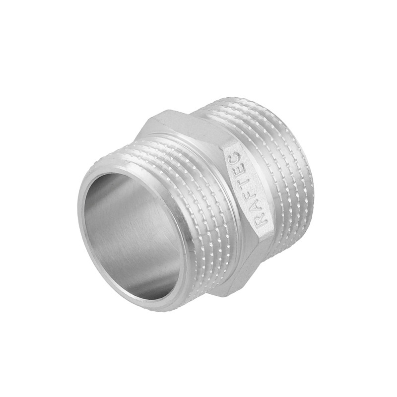 Raftec threaded fitting - nickel-plated brass union for connecting pipeline elements of equal diameter. External straight thread, cylindrical pipe ISO 228, EN 10226. Hexagonal body for a wrench.