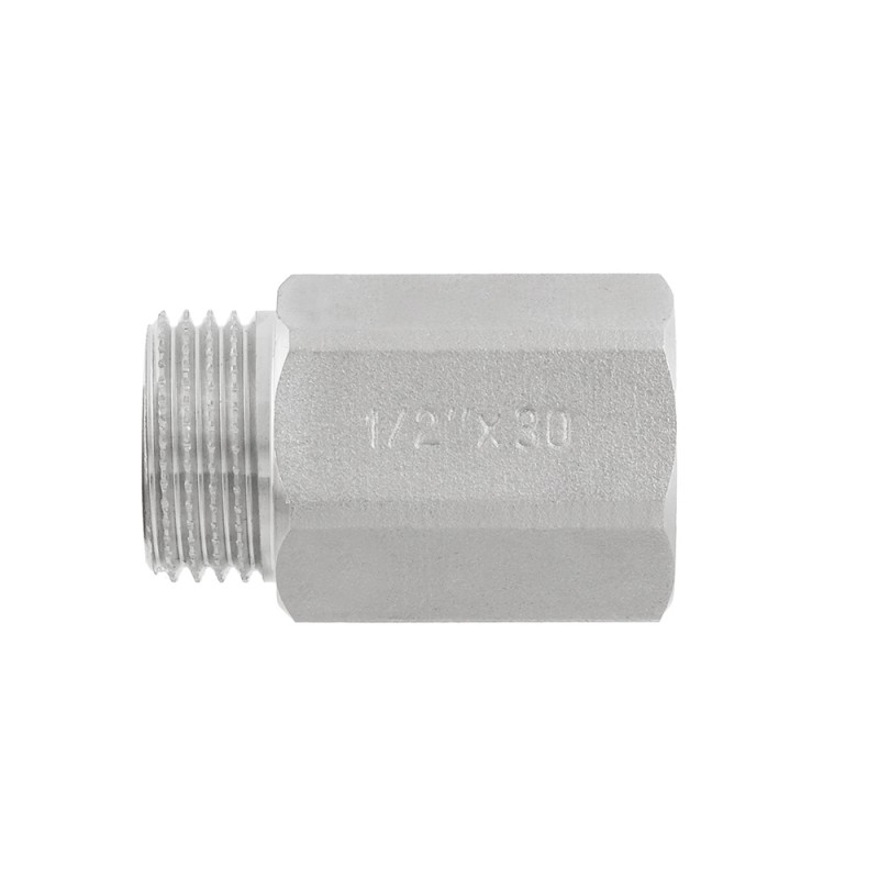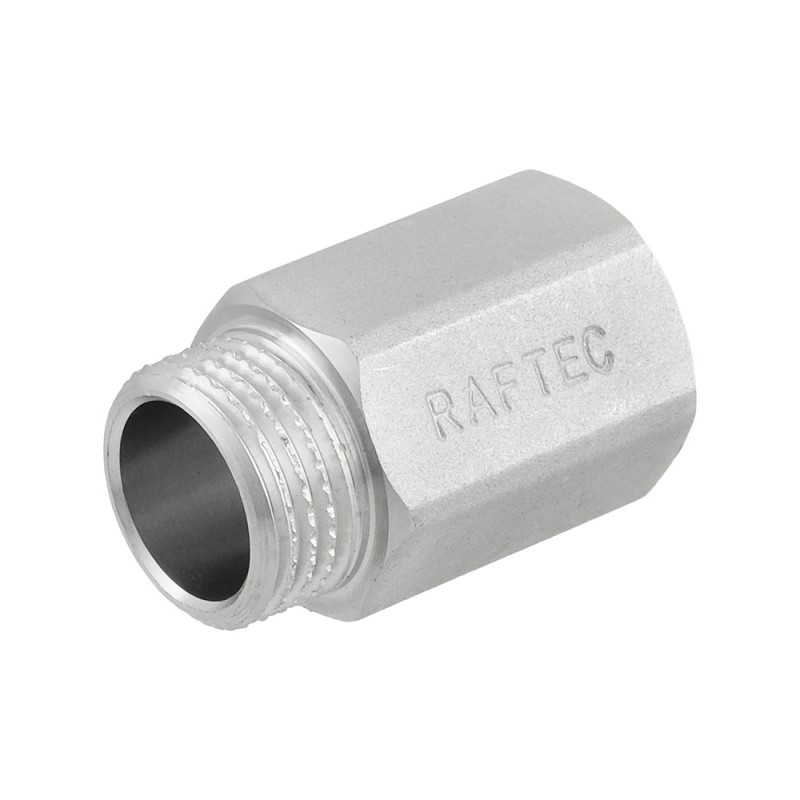 Raftec threaded fitting - nickel-plated brass fitting for extending connections. Internal-external straight cylindrical pipe thread ISO 228, EN 10226. Hexagonal body for a wrench.