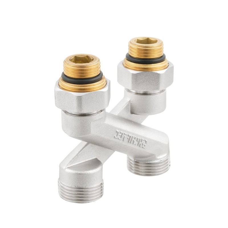 If during the installation of pipelines the end outputs of the supply and return lines were mixed up, a cross-unit for the lower connection of the radiator will become simply irreplaceable for you. After all, such a unit allows you to avoid painful reinstallation of pipes and additional costs. The two elements of the unit are intertwined in the form of "X" and have a center distance of 50 mm, which is quite convenient during installation.