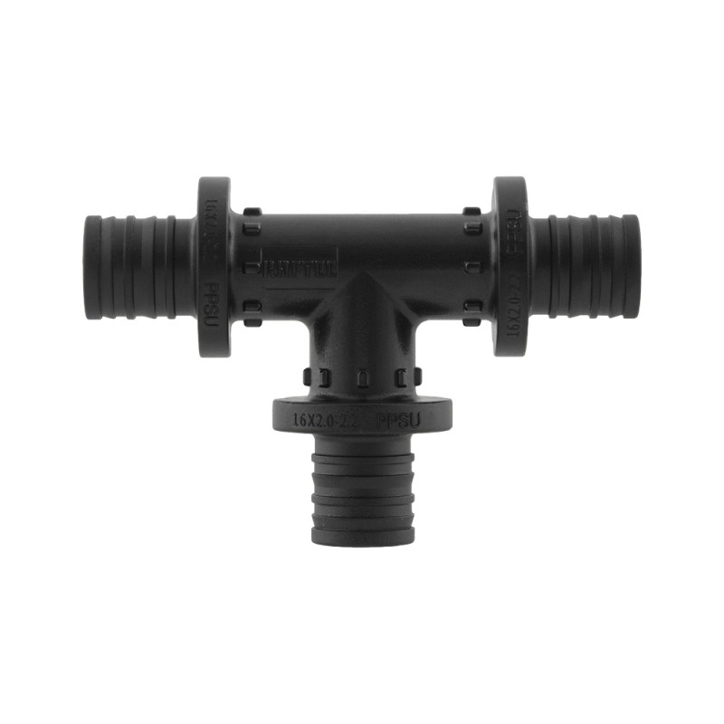 Tension equal tee - The PPSU tee is designed to create connections in PEX-A, PEX-B, PEX-C, and PERT cross-linked polyethylene piping systems. It is used in drinking, domestic, industrial, cold and hot water supply, heating, and compressed air systems.
