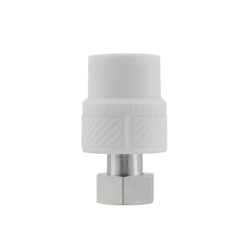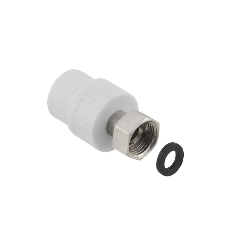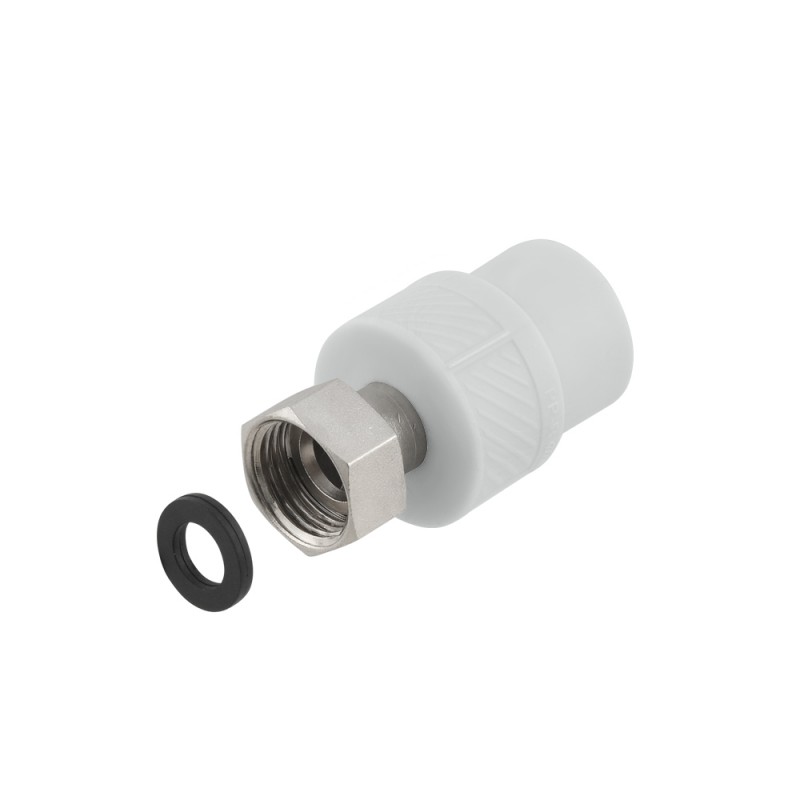 Straight polypropylene coupling with union nut for connecting polypropylene pipe and engineering system fitting with threaded connection. The fitting thread is internal pipe thread.