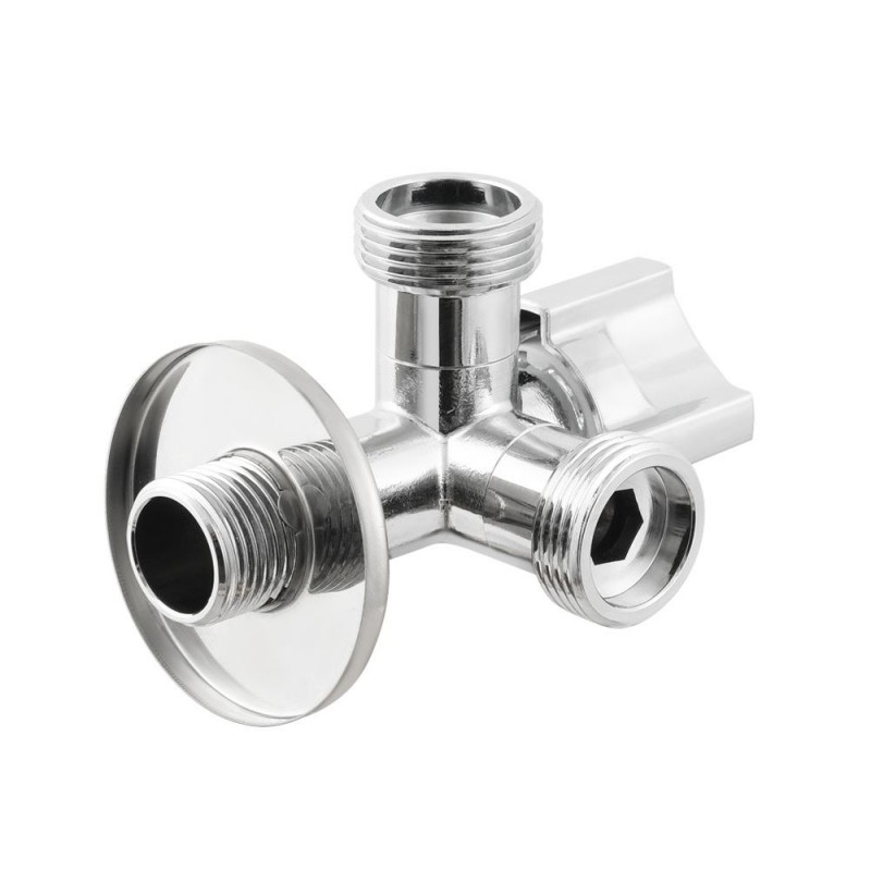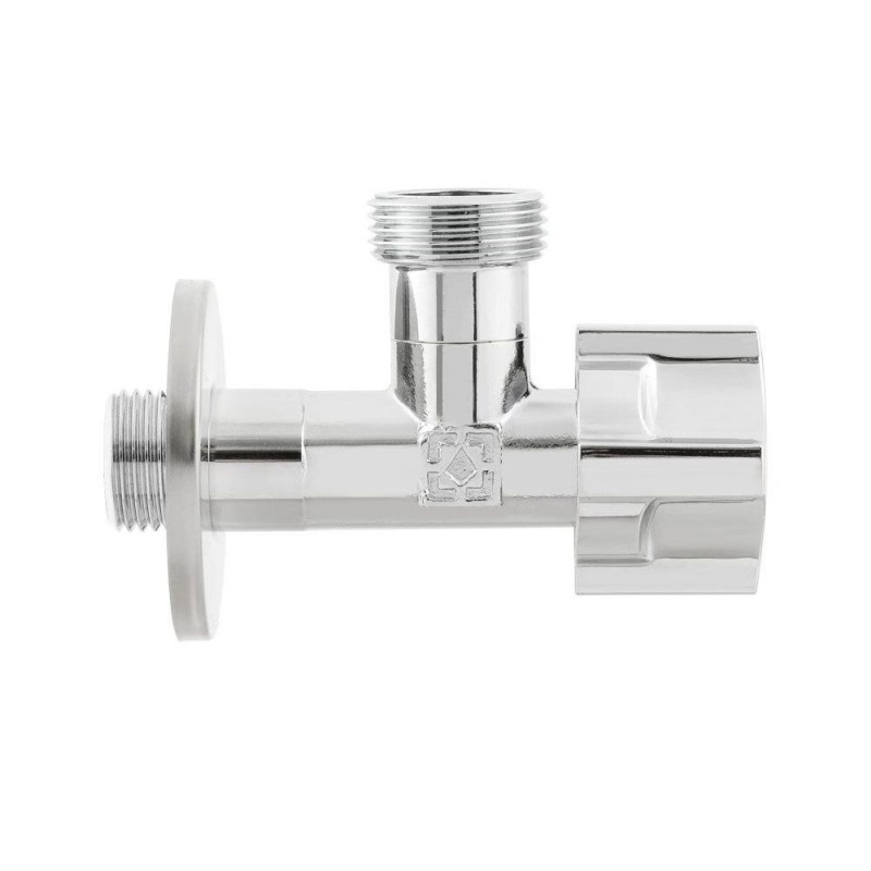 The Raftec angled appliance valve with a four-position ball mechanism is designed for connecting sanitary appliances — toilets, washing machines, dishwashers, water heaters, and similar equipment — to hot and cold water supply systems. The body is made of CW617N brass using hot forging and features a durable chrome finish that ensures long service life and corrosion protection. The valve is equipped with a ball shut-off element with four indexed operating positions, allowing the water flow to be directed to two outlets simultaneously, to one selected outlet, or completely shut off. This design provides reliable operation, precise flow control, and convenience in everyday use. The valve is compatible with flexible hoses with a union nut. A decorative escutcheon is included.